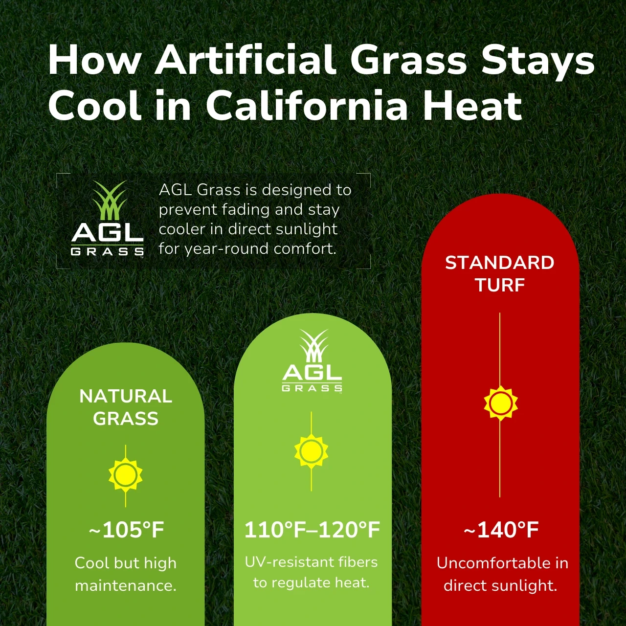 AGL Grass North specializes in turf systems designed for scorching markets like Sacramento, utilizing UV-stable fibers, cooling infills, and contemporary backing systems to keep lawns and playgrounds more comfortable and usable while the sun blazes.